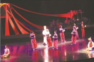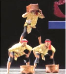 Gambar diatas menunjukkan seorang penari berdiri di atas punggung kedua temannya. Tenaga yang digunakan oleh penari untuk menahan temannya tentu lebih besar dibandingkan dengan yang berdiri di atas punggung. Kekuatan tenaga menahan temannya tertumpu pada kedua kaki. Tenaga yang dikeluarkan oleh kedua penari yang menyangga temannya akan semakin kuat jika berjalan berpindah dari satu tempat ke tempat lainnya.